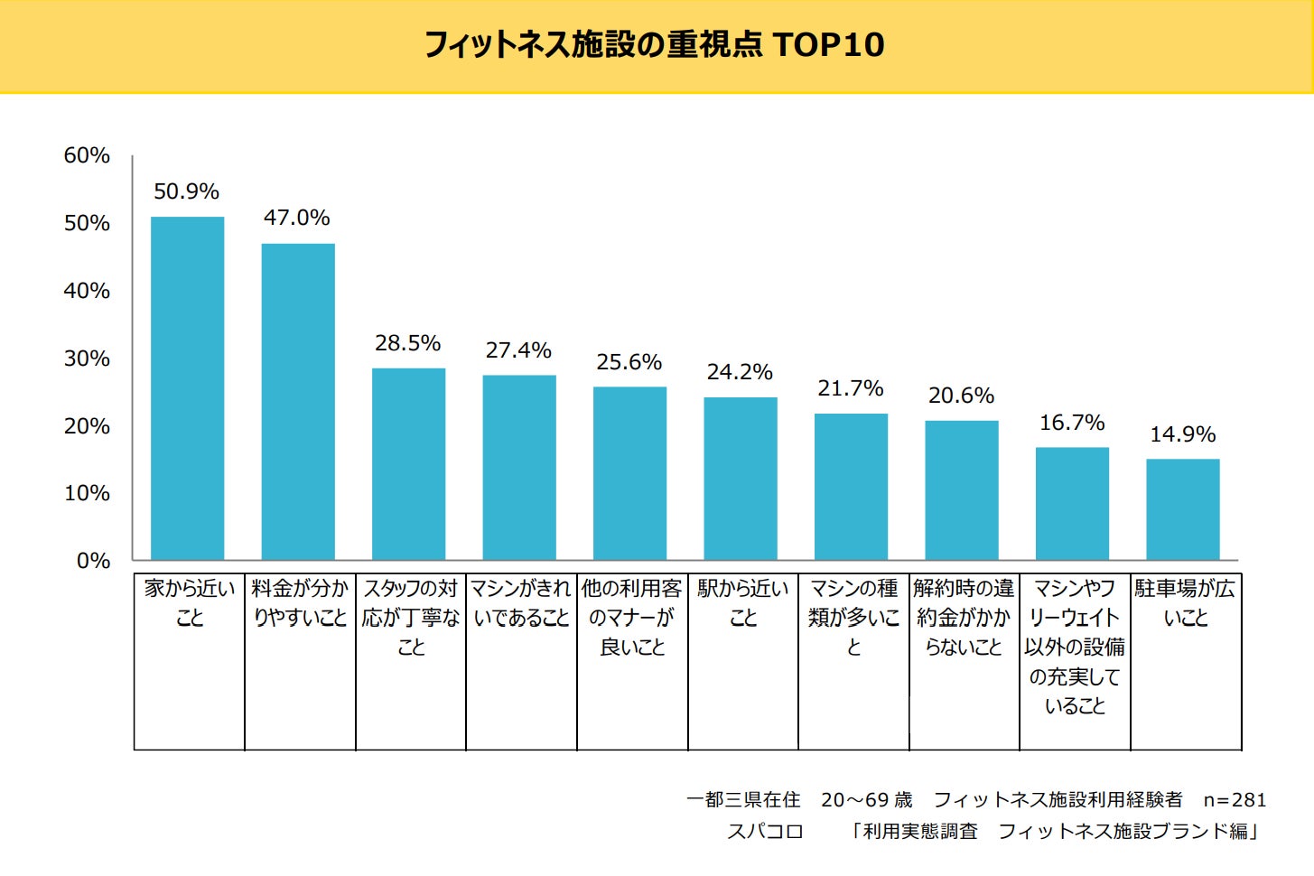 フィットネス施設の重視点は上位から「家から近いこと」(50.9%)、「料金が分かりやすいこと」(47.0%)、「スタッフの対応が丁寧なこと」(28.5%)、「マシンがきれいであること」(27.4%)が続く結果に。