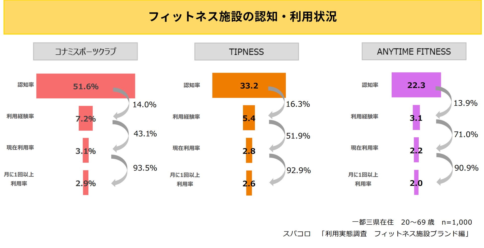 一都三県在住の20~69歳の1,000人に聞いたフィットネス施設の認知・利用状況についてみてみると、現在利用率上位3サービスは「コナミスポーツクラブ」、「TIPNESS」、「ANYTIME FITNESS」という結果に。
