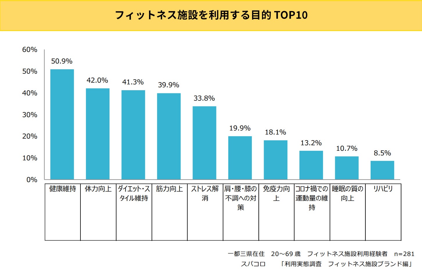 フィットネス施設を利用する目的は、上位から「健康維持」(50.9%)、「体力向上」(42.0%)、「ダイエット・スタイル維持」(41.3%)、「筋力向上」(39.9%)が続く結果に。フィットネス施設利用者の半数以上が健康維持を目的にフィットネス施設を利用していることがわかりました。