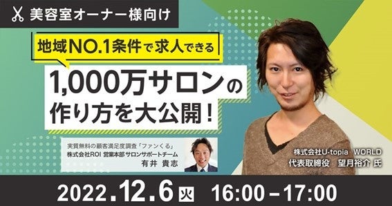 国内最大級の顧客満足度向上プラットフォーム「ファンくる」を運営する株式会ROI(本社:東京都千代田区、代表取締役社長:山口敬人)は株式会社U-topia WORLD(本社:東京都町田市、代表取締役:望月裕介)の望月社長をお迎えし、「地域NO.1条件で求人できる 1,000万サロンの作り方を大公開!」 (定員:100名/無料)を12月6日(火)に開催いたします。(申し込み先:https://biz.fancrew.jp/seminar_contact6?=pr1)