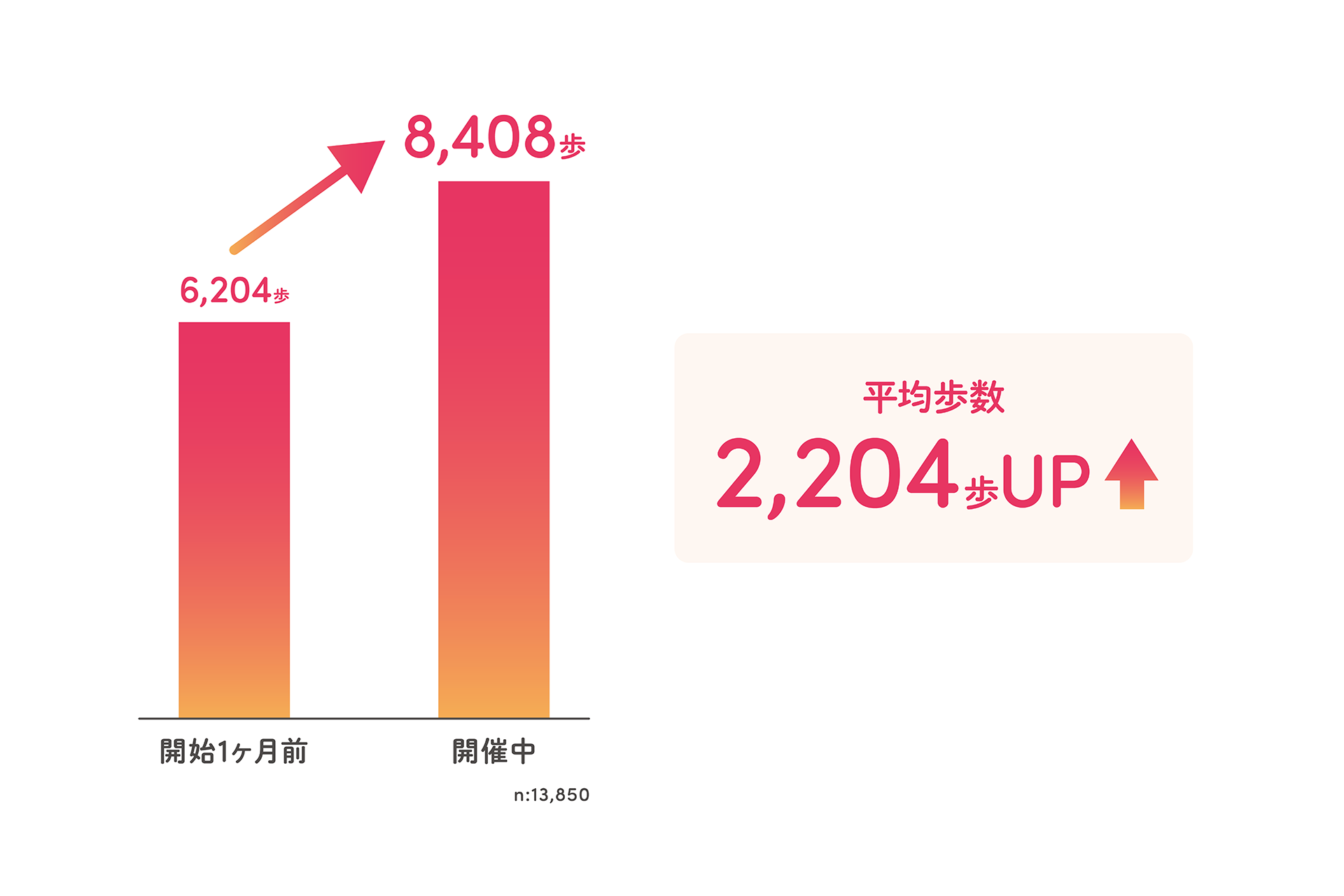 今回のウォークラリーイベントでは、イベント開始1ヶ月前の平均歩数と比較をすると、平均歩数は2,204歩増加しています。(前回は1,640歩増加)