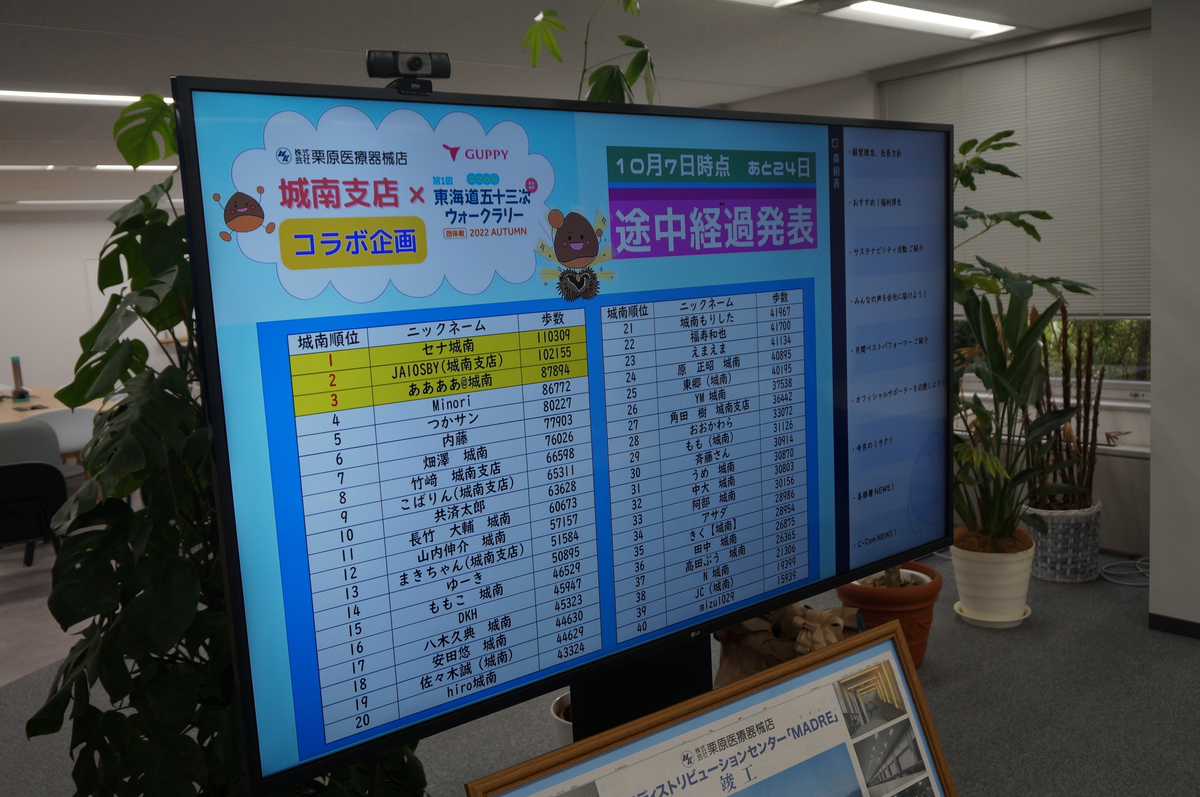 あとは、本社の協力で、毎週事務所内のサイネージに支店内のランキングも発表しています。週末頑張って30,000歩歩いたのに全然順位が変わってなくて、社員に聞いてみると「40,000歩も歩きました!」と言われて、悔しい気持ちになったりもしています(笑)