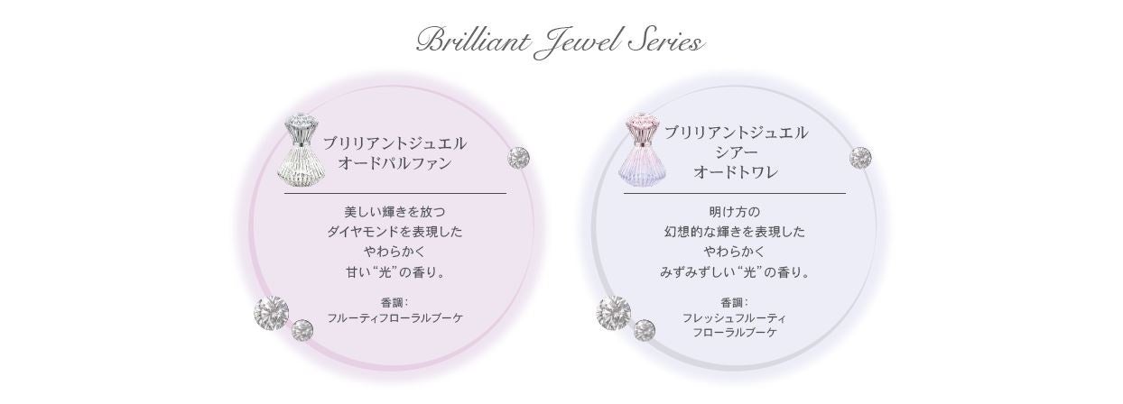 ブリリアントジュエル オードパルファン、ブリリアントジュエル シアー オードトワレのミニボトル(各7. 5m L )とブリリアントジュエル パフュームド ハンドクリーム(40g)が楽しめる特別な限定コフレ。フレグランスは通常のデザインをそのまま小さくした、限定ミニチュアデザイン。ハンドクリームは、輝くレーステープをチューブにあしらうことで、限定デザインにふさわしい華やかで高級感が漂う印象に仕上げました。