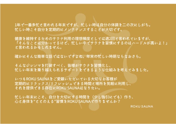 株式会社ROKU(本社:東京都千代田区、代表取締役 沖 拓史)は、非対面・非接触の完全個室のプライベートサウナ「ROKU SAUNA(ロクサウナ)たまプラーザ店」において、ユーザー様が年末の忙しい時期を健康に乗り越えていただくため、”サウナ習慣”の確立をサポートする「”ととのい習慣”サポート割」を11月16日(水)より開始します。