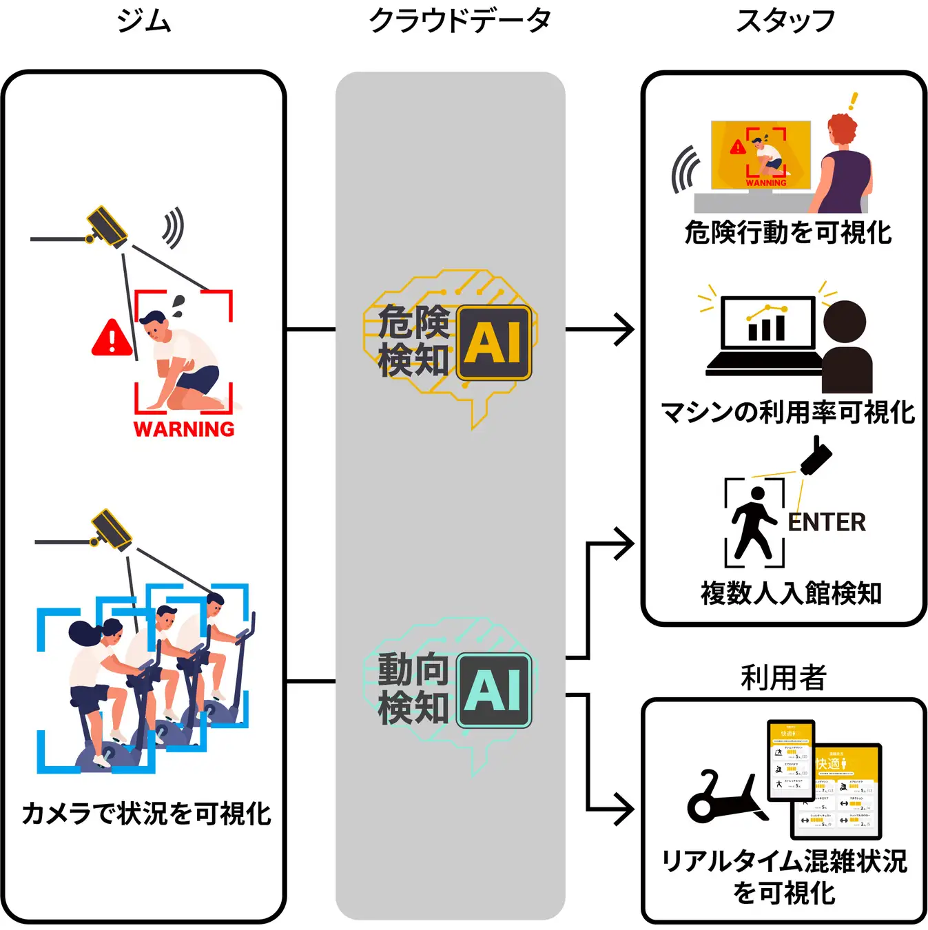 ジム内の防犯カメラの映像を活用し、ジム運営をAI化するDXサービスです。