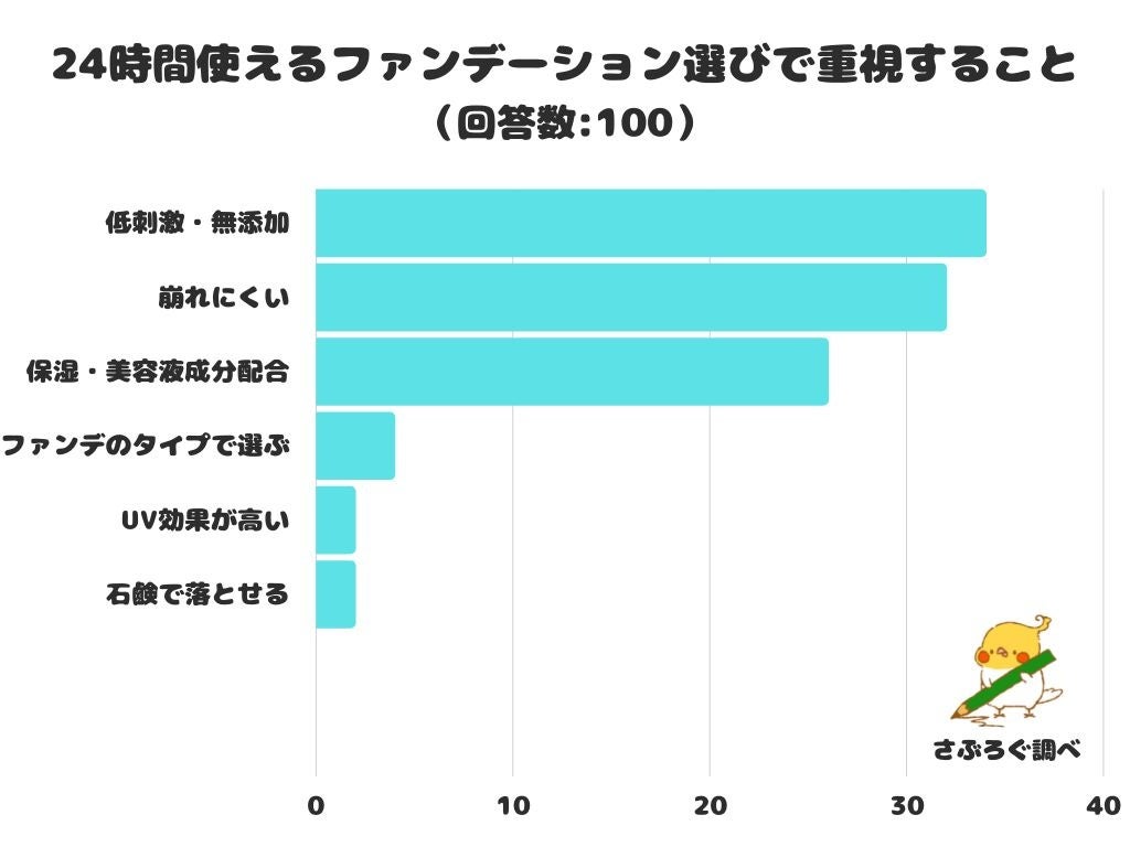 24時間使えるファンデーション選びで重視することをアンケートにて調査したところ、1位は「低刺激・無添加」でした。