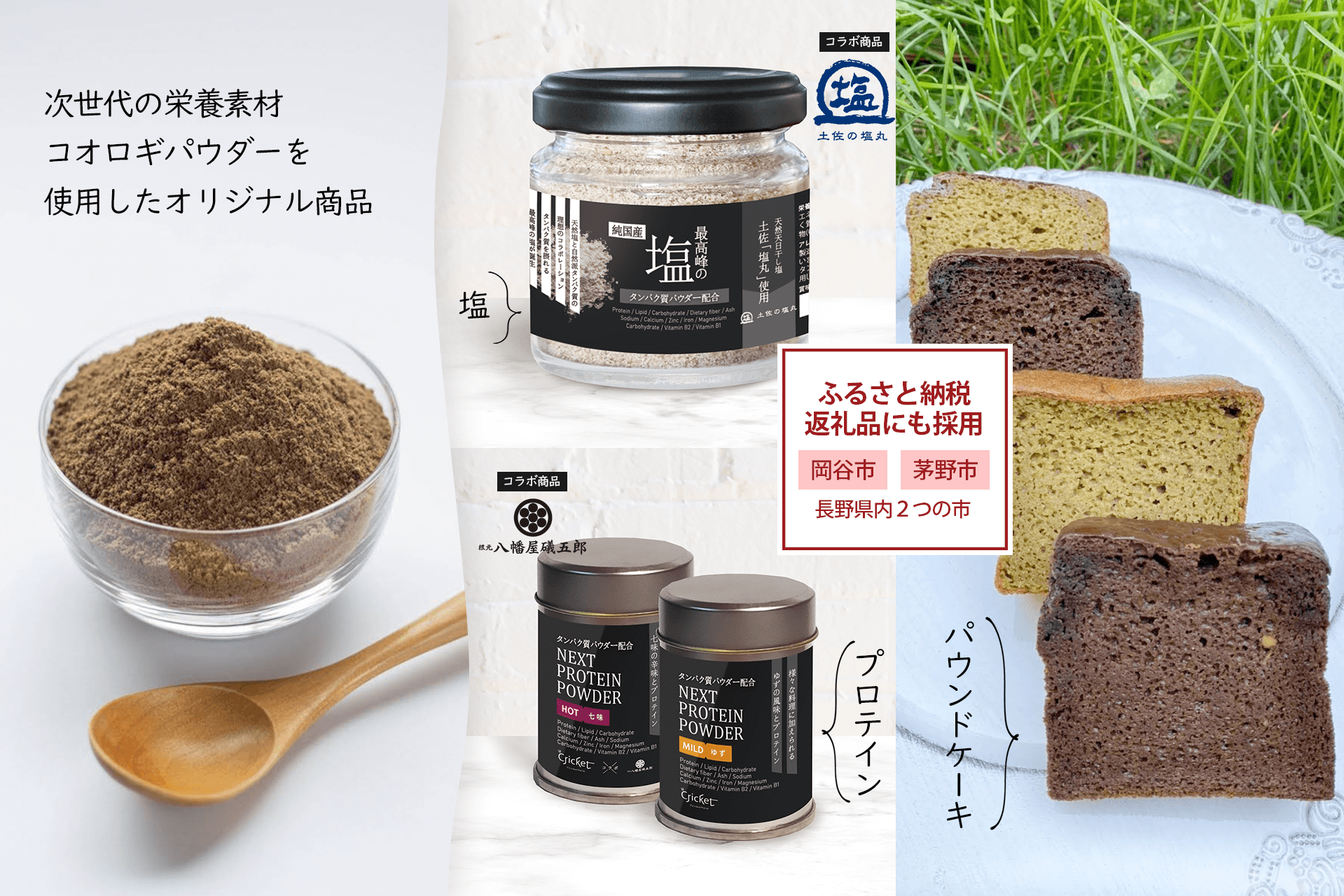 パウダー状で取り扱いがしやすく幅広い食品に利用できることから、自社製品として、美と健康のための「パウンドケーキ」、土佐の塩丸とのコラボによる純国産の「最高峰の塩」、そして「プロテインパウダー」などを開発。これらの商品は長野県岡谷市・茅野市の両市にてふるさと納税返礼品にも採用されました。