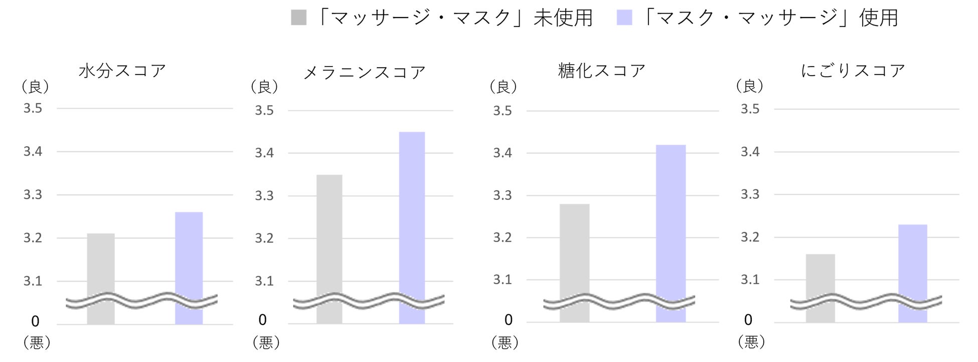 その結果、『マスク・マッサージ』アイテムを使用している人は、していない人と比較し、肌のうるおいに関係する「水分」のスコア、肌色に関係する「メラニン」「糖化」「にごり」のスコアが、有意に高いということが分かりました。