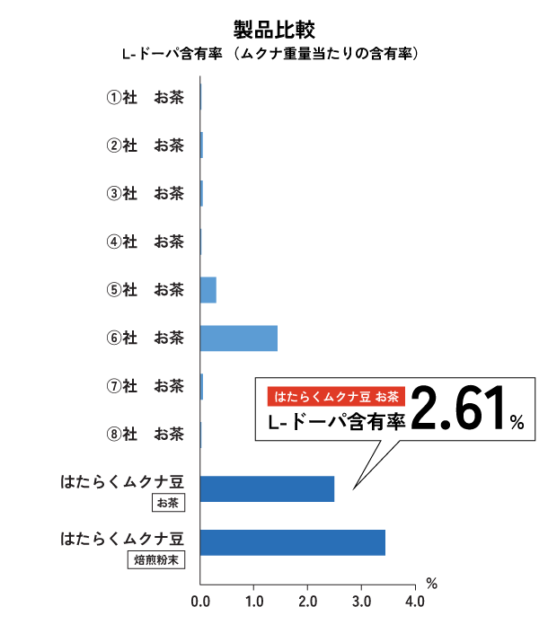 (※4 第29回日本未病学会学術総会抄録集 ムクナ豆(Mucuna pruriens) 製品中に含まれるL-DOPA量の比較)