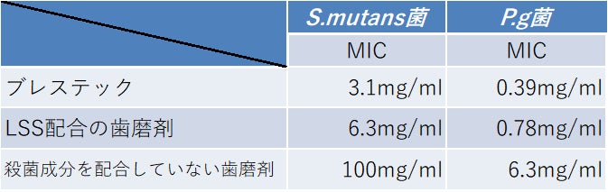 S.mutans菌およびP.g菌において、ホワイトエッセンス ブレステックは、LSS配合の歯磨剤および殺菌成分を配合していない歯磨剤などと比較して抗菌効果が高いことが明らかになりました。