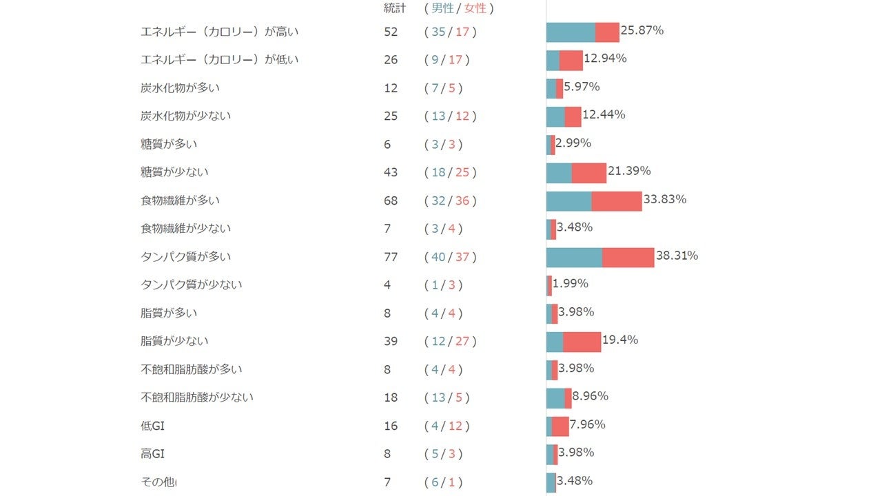 • 男性の34%が「高カロリー」を重視した一方、女性は「高カロリー派」「低カロリー派」が半々