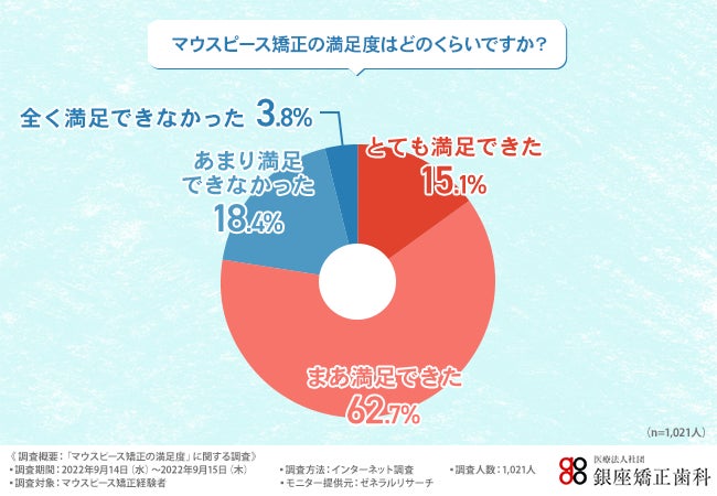 そこで、「マウスピース矯正の満足度はどのくらいですか?」と質問したところ、『とても満足できた(15.1%)』『まあ満足できた(62.7%)』『あまり満足できなかった(18.4%)』『全く満足できなかった(3.8%)』という回答結果となりました。