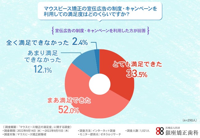 実際にPRや宣伝広告を利用した方に、「マウスピース矯正の宣伝広告の制度・キャンペーンを利用しての満足度はどのくらいですか?」と質問したところ、『とても満足できた(33.5%)』『まあ満足できた(52.0%)』『あまり満足できなかった(12.1%)』『全く満足できなかった(2.4%)』という回答結果となりました。