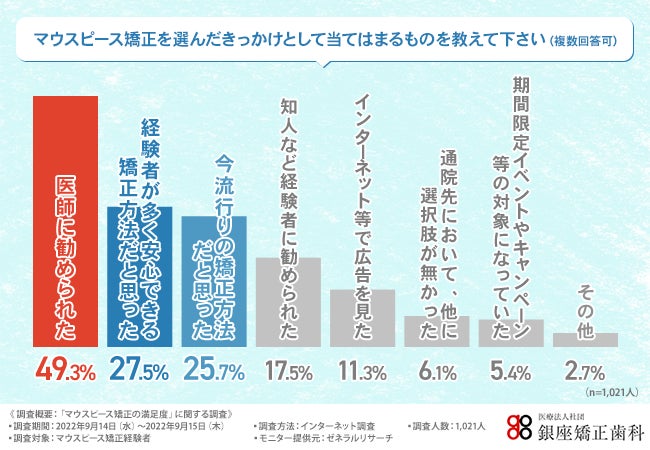 「マウスピース矯正を選んだきっかけとして当てはまるものを教えて下さい(複数回答可)」と質問したところ、『医師に勧められた(49.3%)』と回答した方が最も多く、次いで『経験者が多く安心できる矯正方法だと思った(27.5%)』『今流行りの矯正方法だと思った(25.7%)』と続きました。