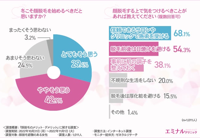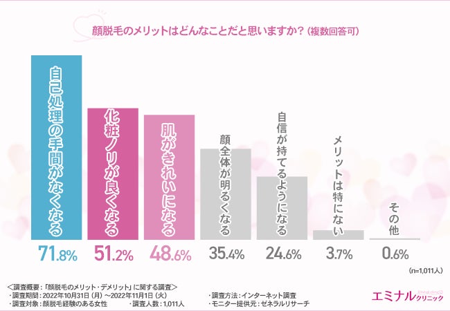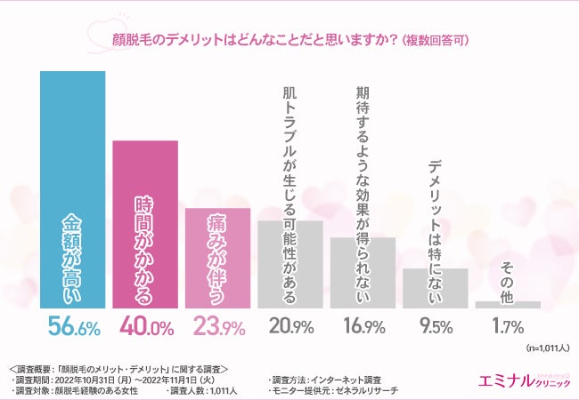 そこで今回、医療脱毛のエミナルクリニック(https://eminal-clinic.jp/lp01/?refmedia=11073)は、顔脱毛経験のある女性を対象に、「顔脱毛のメリット・デメリット」に関する調査を実施しました。