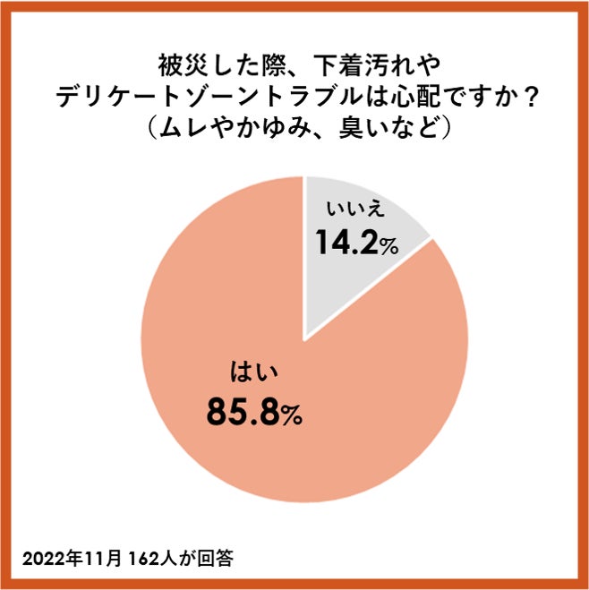 - 85.8%が「被災時の下着汚れやデリケートゾーントラブルを心配している」と回答。