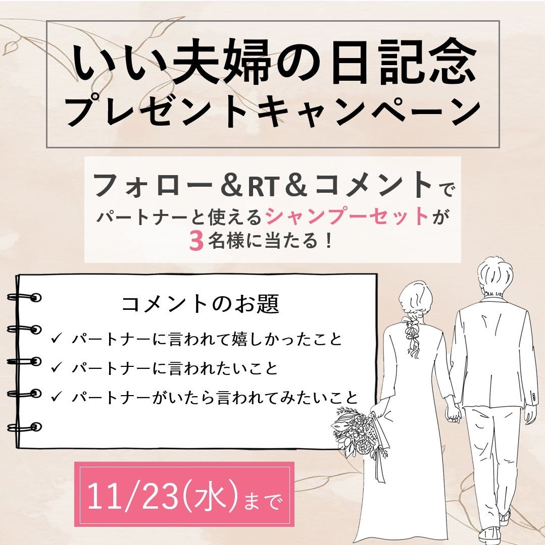 マナラ公式Twitter、R_homme公式Twitterにて、いい夫婦の日を記念し、ペアで使えるシャンプーセットを抽選で、3名様にプレゼントするキャンペーンを実施しています。