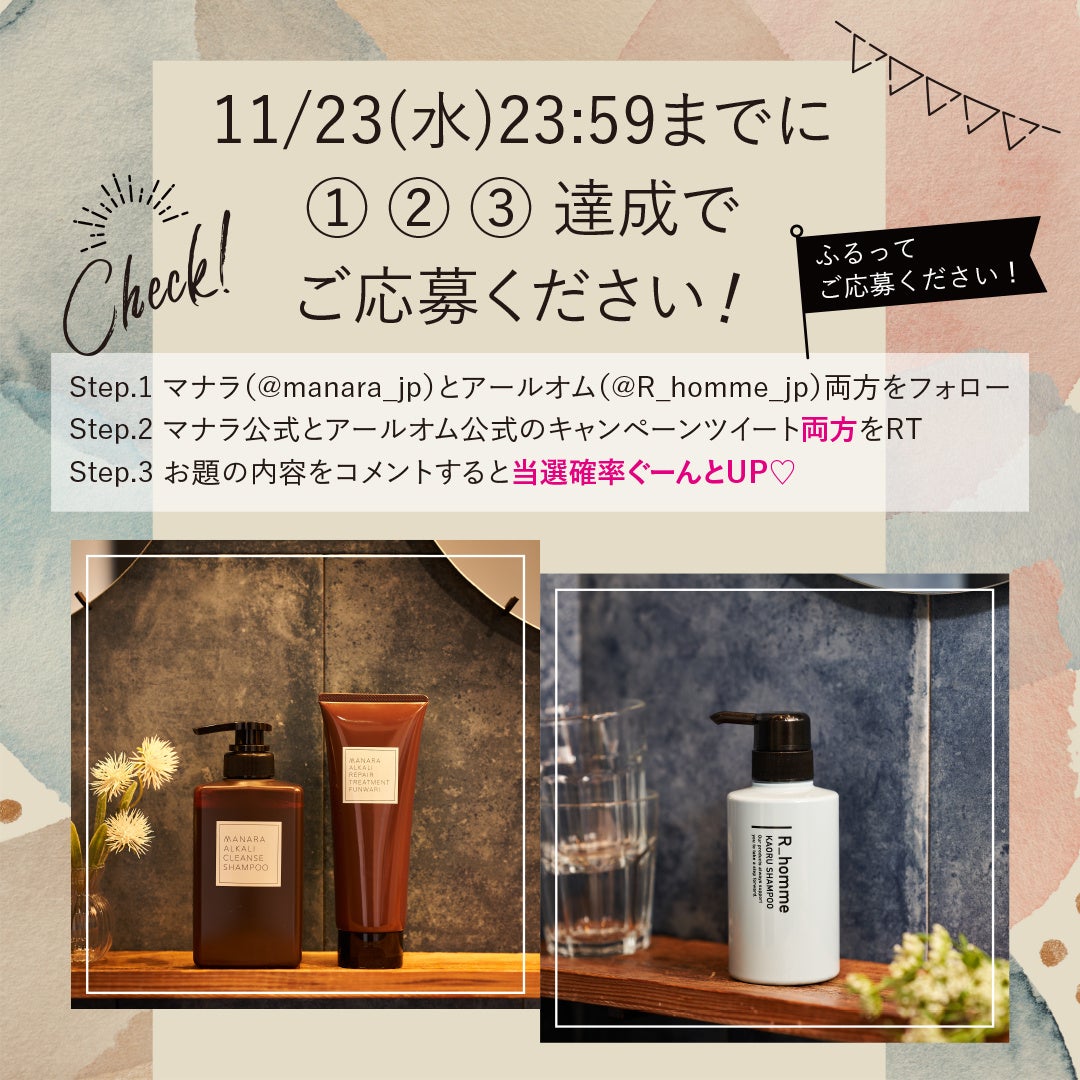 - 【MANARA×R_homme】ペアで使えるシャンプーセットが当たるプレゼントCP実施