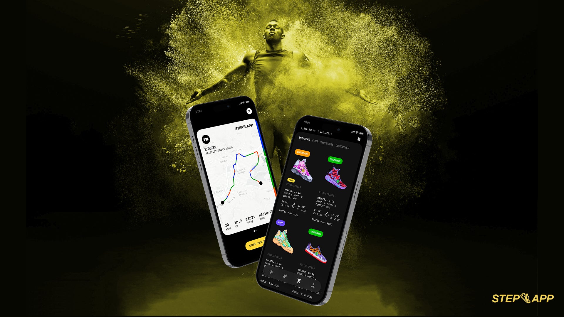 プレイヤーはランニングにより収益を得るために、アプリ内のマーケットプレイスから自分だけのSNEAKと呼ばれるNFT* スニーカーを購入していただきます。より多く走ったりSNEAKをアップグレードしたりすることで、さらに多くのトークンを得ることができるようになります。STEP APPには2つのトークンが存在します。FITFIはSNEAKの購入に使用するSTEP APPのガバナンストークンです。そしてKCALはランニングで獲得できるトークンで、SNEAKのアップグレードや現金化などに使用することができます。