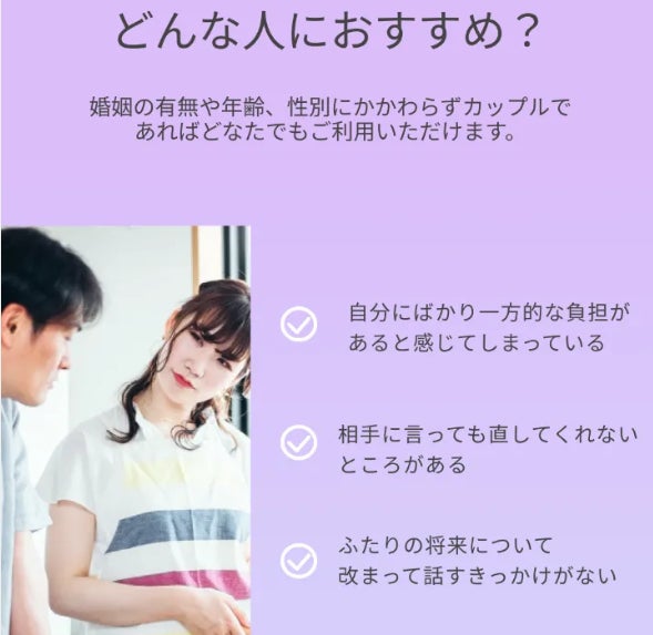 日々の生活の中によこたわる「どこまで言って良いのか分からない」、「真剣な話を切り出しづらい」といった気持ちを、カウンセリングを通してほぐし、お互いの価値観や関係性を改めて見つめ直す時間を提供します。