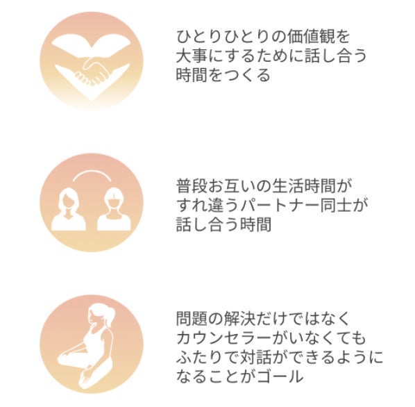 お互いの思い込みや考えの不一致を解きほぐしながら、ふたりだけでは解決が難しい問題に取り組み、最終的にはふたりだけでコミュニケーションが円滑に進むように伴走をしていきます。