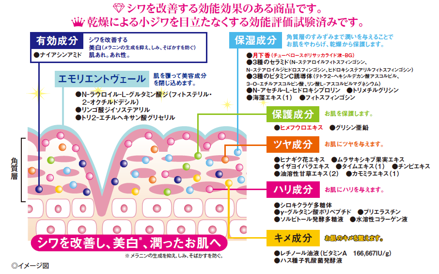 従来の配合成分である3種のビタミンC誘導体※3、レチノール※4、3種のセラミド※5などの保湿成分に加え、お肌に潤いを与える月下香※2、お肌を保護するヒメフウロエキスを新配合。