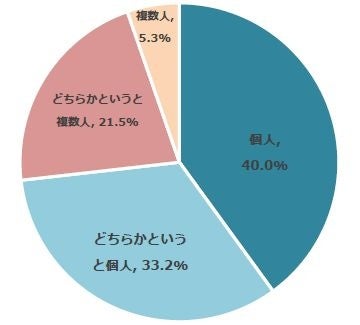 「ファスティング(断食)」を実践する場合、個人と複数(知人など)、どちらがより効果につながると思うか質問したところ、73.2%が「個人」(個人:40.0%、どちらかというと個人:33.2%)、26.8%が「複数人」(複数人:5.3%、どちらかというと複数人:21.5%)と回答しました。