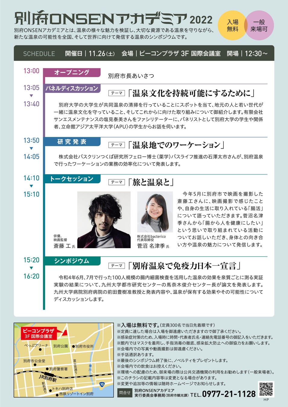 さらに、今年5月に別府市で映画を撮影された、俳優で映画監督の斎藤工さんをお迎えし、㈱bacterico代表取締役の菅沼名津季さんと「温泉」と「映画」と「腸活」について語っていただきます。