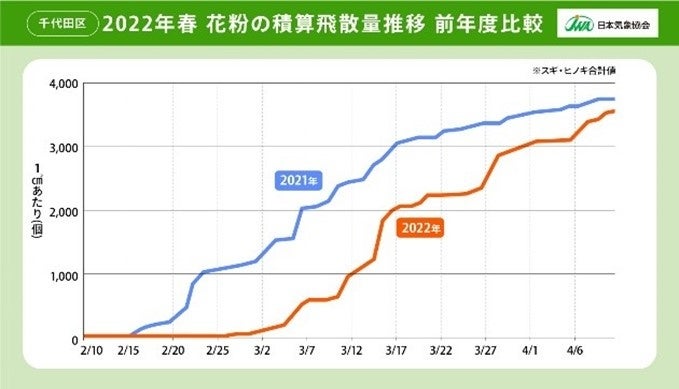右) tenki.jp「2022年春 花粉の積算飛散量推移 前年比較」2022年4月21日 日本気象協会発表