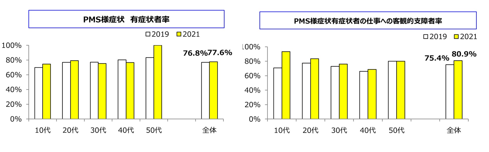 また、PMSにより仕事への支障があるかどうかを聞くと、2019年は全体で「75.4%」だったのに対し、2021年は「80.9%」とやや増加していることから、自身の症状を客観的に見ることができる従業員が増えることで、PMS症状の改善傾向があるとも考えられます。