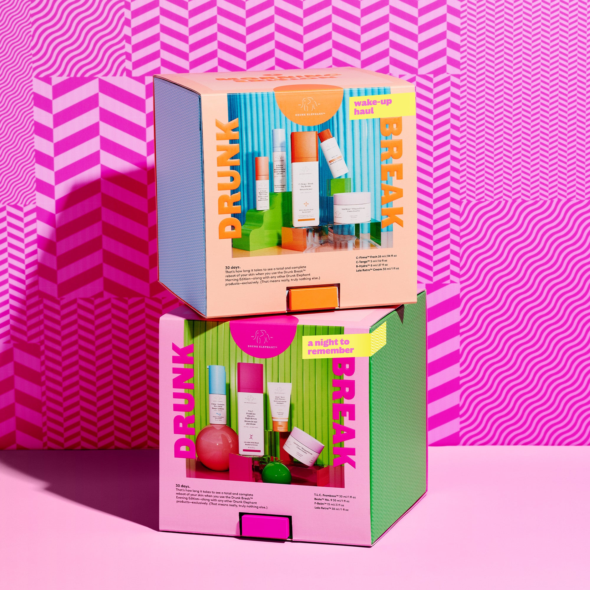 それぞれのキットには、ドランク エレファントの人気セラムの現品と一緒にそれそれ朝・晩のルーティンにぴったりなアイテム3品を特製サイズで同封しております。