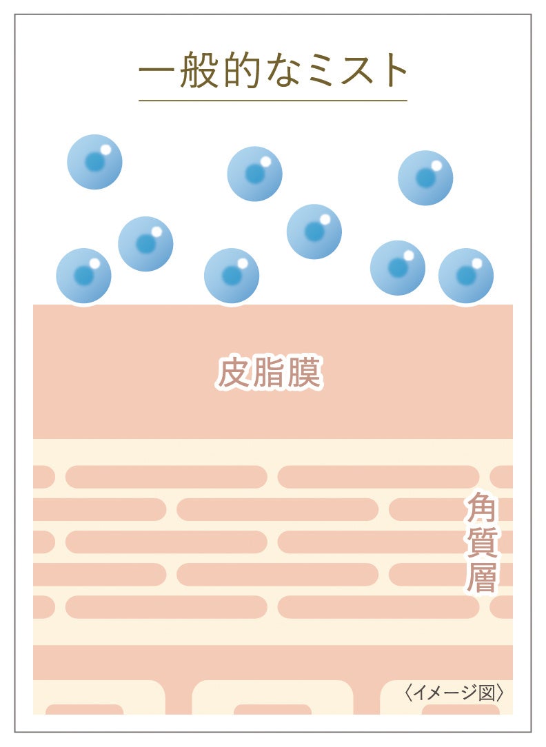 以下は一般的なミストのイメージ。粒子が大きいので、水分が肌の表面に残ってしまい、うるおっているというより濡れている感覚。