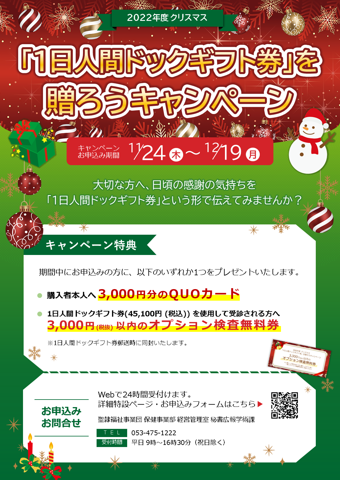 社会福祉法人 聖隷福祉事業団(法人本部:静岡県浜松市/理事長:青木善治)が運営する、保健事業部(事業部長:福田崇典)では、静岡県内の健診機関で初めての取り組みとして、「クリスマスに大切な人へ“健康”をプレゼント」をコンセプトにした『1日人間ドックギフト券を贈ろうキャンペーン』を、11月24日(木)からスタートします。