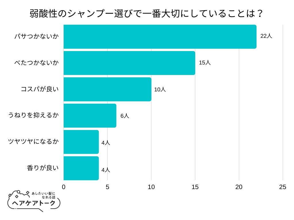 「弱酸性のシャンプー選びで一番大切にしていることは?」とアンケート調査した結果、1位は『パサつかないか』でした。