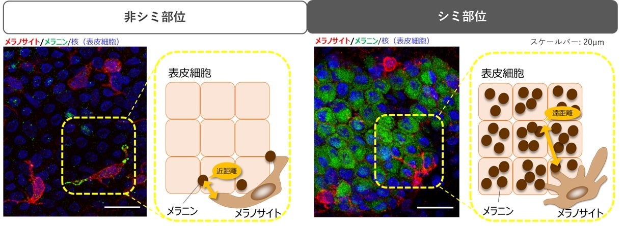 また当社のシミ予防研究においても、世界初(※2)の技術によるシミ部位の広範囲(※3)な解析から、シミの発生源であるメラノサイト(メラニン生成細胞)から遠く離れた表皮細胞にまでシミの原因であるメラニンが拡散されていることを確認しました。新たなシミを防ぐには、メラニンの黒色化を無色にとどめる(※4)ことが鍵になります。