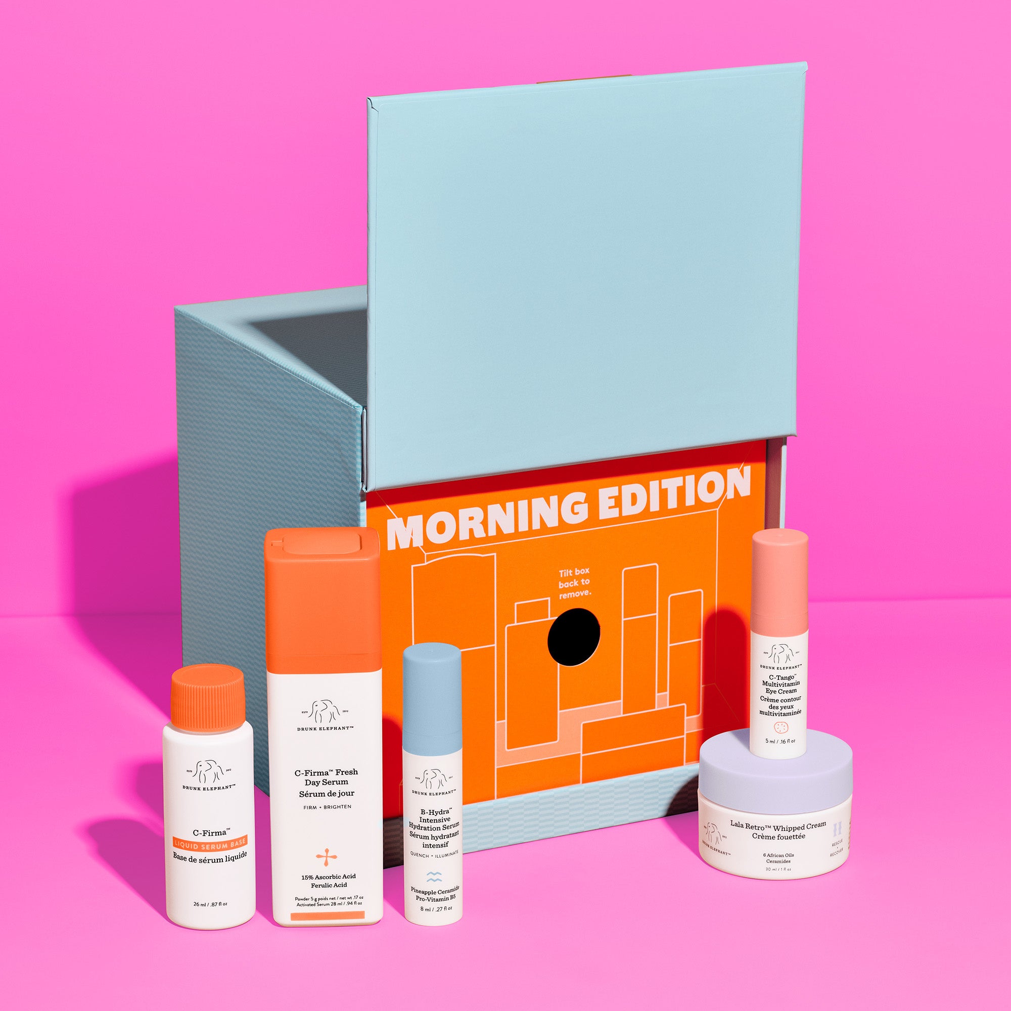 お目覚め時間が楽しくなる朝にぴったりなアイテムが詰まったキット。うるおってより明るく引き締まったヘルシーな肌で、一日をフレッシュにスタートできます。このキットでスキンケアすればドランクブレイク*を体感でき、肌はヘルシーでうるおいバランスの取れた状態に整えられます。