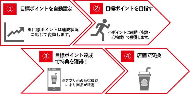 アクティブチャレンジでは、1週間ごとに設定される目標ポイントを達成することで、特典(ドリンクチケット等)を必ず獲得でき、楽しみながら運動習慣を身につけることで、健康増進につなげることを企図しています。