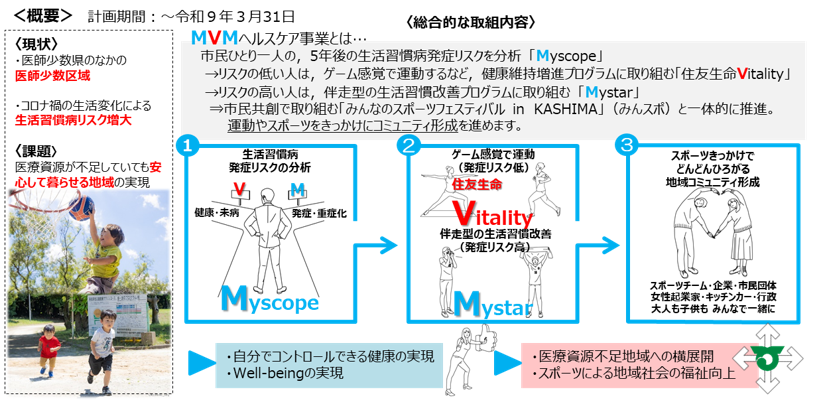 株式会社PREVENT(代表取締役 萩原 悠太、以下「PREVENT」)と茨城県鹿嶋市(鹿嶋市長 田口 伸一)、住友生命保険相互会社(取締役 代表執行役社長 高田 幸徳、以下「住友生命」)が共同で開発している「鹿嶋市MVMヘルスケア事業」(以下「本事業」)がスポーツ庁主催の「スポーツ・健康まちづくり優良自治体表彰2022」※1を受賞しました。本事業は2021年11月10日に鹿嶋市、住友生命、PREVENTの3者で締結した包括連携協定の取組みの一環でもあり、今後もPREVENTは鹿嶋市民の「一病息災」の実現に貢献していきます。