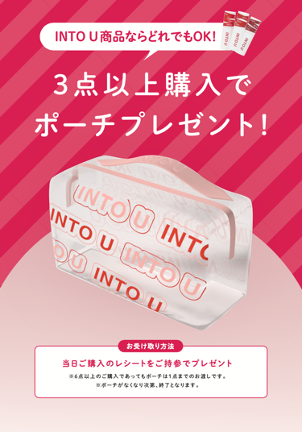 店頭では、INTO Uの商品を3点以上ご購入いただいた方に、INTO Uオリジナルの透明化粧ポーチをプレゼントするノベルティもご用意しています。