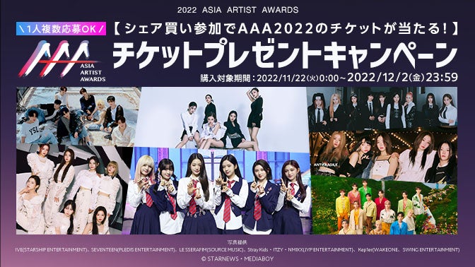 - 『PONPISH(ポンピッシュ)』にてシェア買い商品を1点以上ご購入いただいた方の中から、抽選で100名様に「2022 Asia Artist Awards」のチケット(非売品)をプレゼント致します。