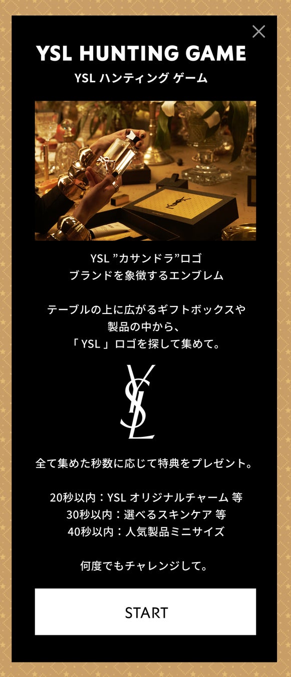 YSLのカサンドラロゴを探すゲーム。クリアすると集めた秒数に応じて、YSLオリジナルチャーム、選べるスキンケア、人気製品ミニサイズの特典のほかスペシャルなWELCOMEギフトもプレゼント!