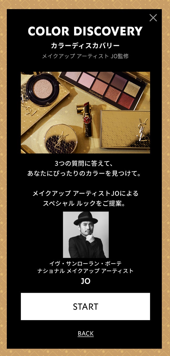 3つの質問に答えると、YSL BEAUTY ナショナル メイクアップ アーティストJOが、あなたにぴったりのスペシャルルックを64パターンの中からご提案。YSL人気のアイシャドウやリップを使ったルックをご紹介します。