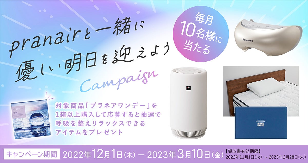 イベントの反響を受け、「呼吸」が瞳にも重要となることをより多くの方に伝えたい、瞳にやさしいコンタクトレンズを選んでいただくことや「ストレスからの解放」「心地よい生き方」にフォーカスすることで、自分に優しい明日を作るきっかけにしてほしい、という想いから、酸素透過率の高いソフトコンタクトレンズ「プラネアワンデー」をご購入のお客様を対象としたプレゼントキャンペーンを2022年12月1日(木)より開催いたします。