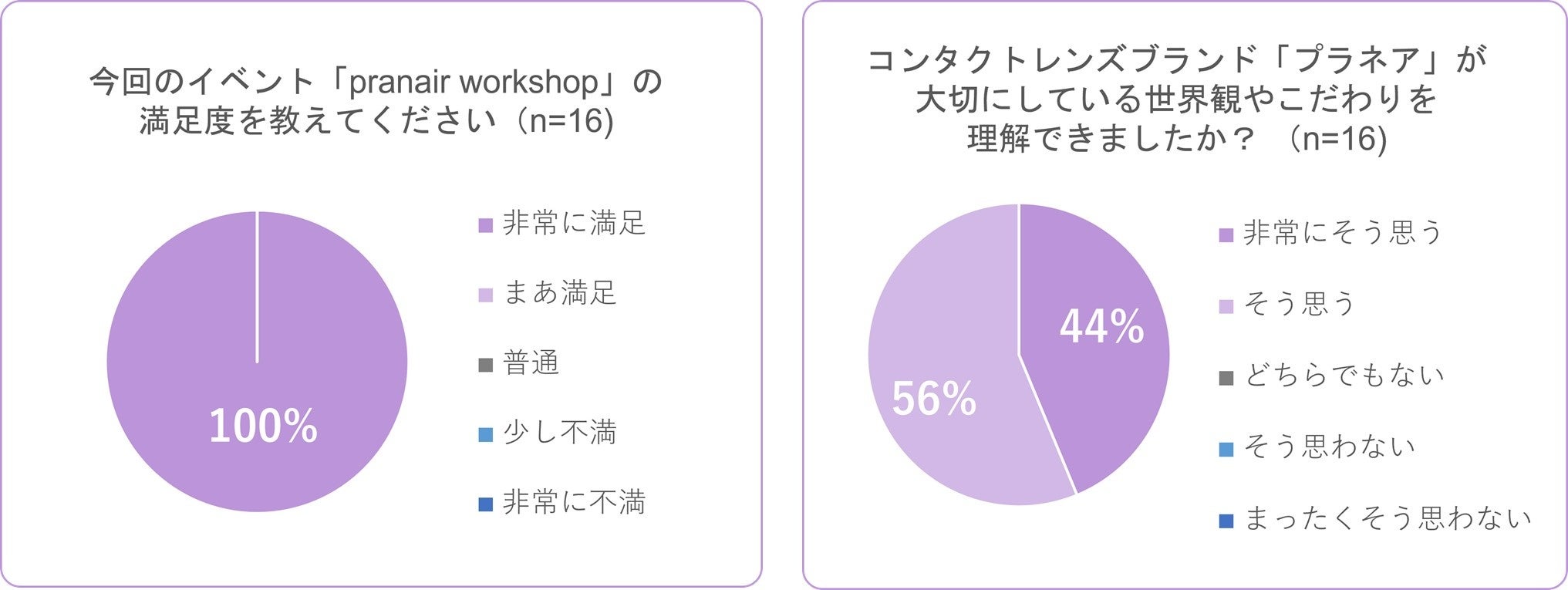 イベント後に実施した参加者アンケートでは、「太陽の暖かさと気持ちのいい風を受けながらヨガを体験して、とても気持ちよかったです。トークイベントも普段気にしてる事が心が楽になる話を聞けて、参加出来て良かったです。(40代/女性)」・「コンタクトレンズを利用していますが、目に酸素をとか呼吸をということを考えたことがなったので、ヨガを通して自分の体を知ったり大切にする意識ができたので、自分の目のこともちゃんと考えようと思えた。(30代/女性)」・「ヨガがとても気持ち良くて最高でした!トークライブも参考にさせていただきたいことがたくさん聞けました!(20代/女性)」などの感想が寄せられ、満足度も“非常に満足”と回答した方が100%と、高い評価を得たイベントとなりました。