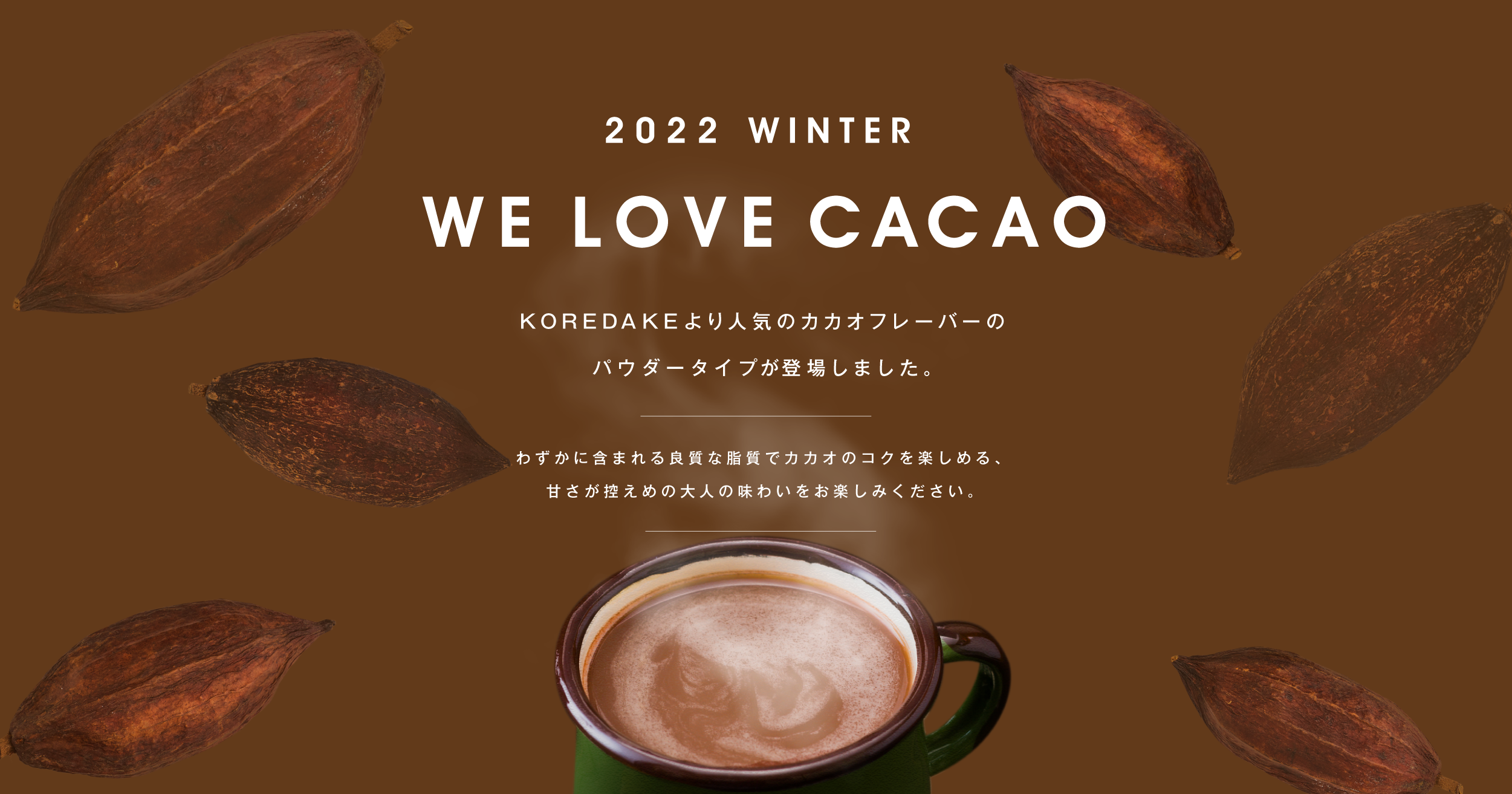 冬にうれしい、ホットもおいしい、甘さ控えめで大人な味わいのカカオフレーバー。寒い朝でも、おいしく飲めるようにと、大豆感を弱め、よりカカオのコクを際立たせるため、カカオパウダーにわずかに含まれる良質な脂質が味作りのポイントです。『KOREDAKE』は健康のためにと我慢しながら飲むのではなく、日常のちょっとした幸せなひとときとして、楽しみながら飲んで欲しいという想いで様々なフレーバーを探求しています。