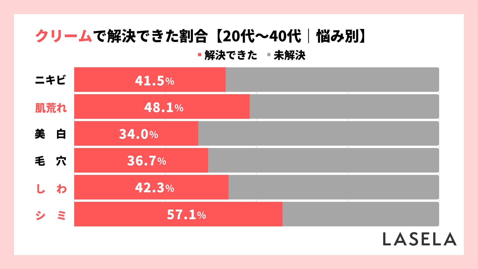 続いて、クリームで肌の悩みを解決できた人を悩み別で比較してみると、最も解決した割合が高かった悩みは「シミ(57.1%)」、続いて「肌荒れ(48.1%)」、「しわ(42.3%)」の結果となりました。