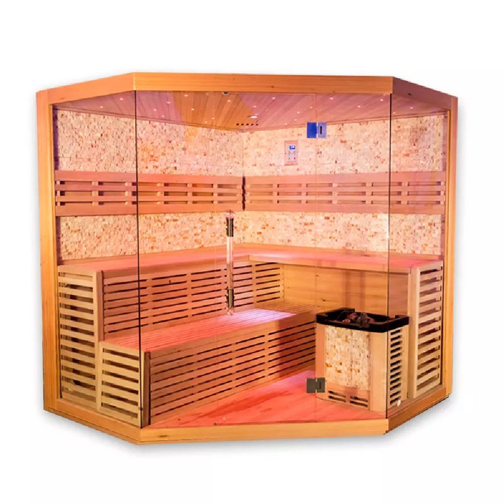 ●カナディアン ヘムロック木材とストーンの内装、3面強化ガラスでモダンなサウナ空間
