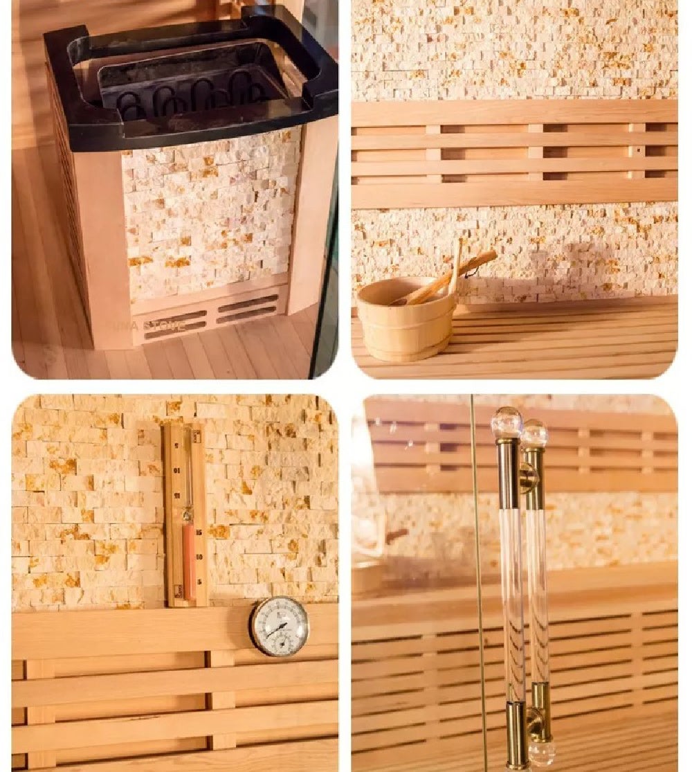 • カナディアン ヘムロック木材とストーンの内装、3面強化ガラスでモダンなサウナ空間
