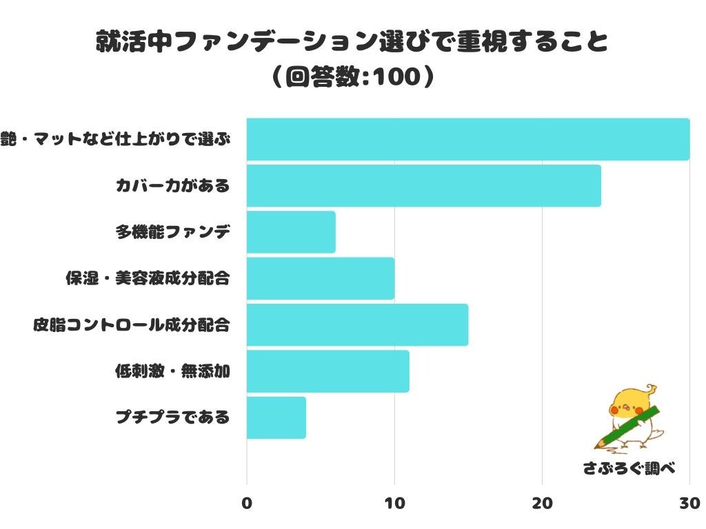 就活中ファンデーション選びで重視することをアンケートにて調査したところ、1位は「艶・マットなど仕上がりで選ぶ」でした。