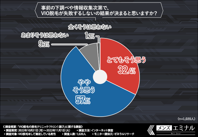 そこで、「事前の下調べや情報収集次第で、VIO脱毛が失敗するしないの結果が決まると思いますか?」と質問したところ、『とてもそう思う(32.4%)』『ややそう思う(57.1%)』『あまりそうは思わない(9.3%)』『全くそうは思わない(1.2%)』と続きました。